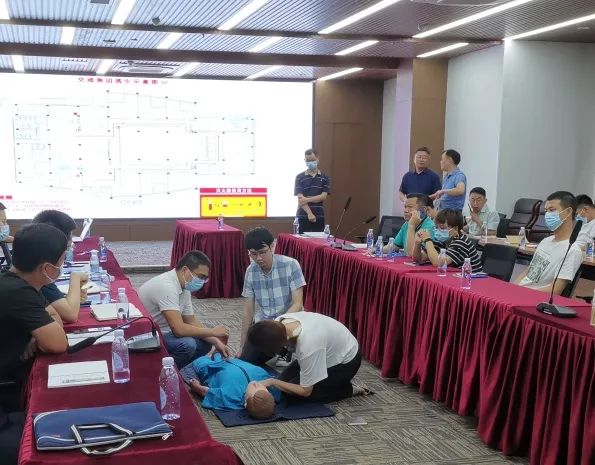 培训现场讲解了心搏骤停相关知识,并就如何进行心肺复苏、人工呼吸等进行模拟人现场分步讲解演示,学员们纷纷上场操作学习。