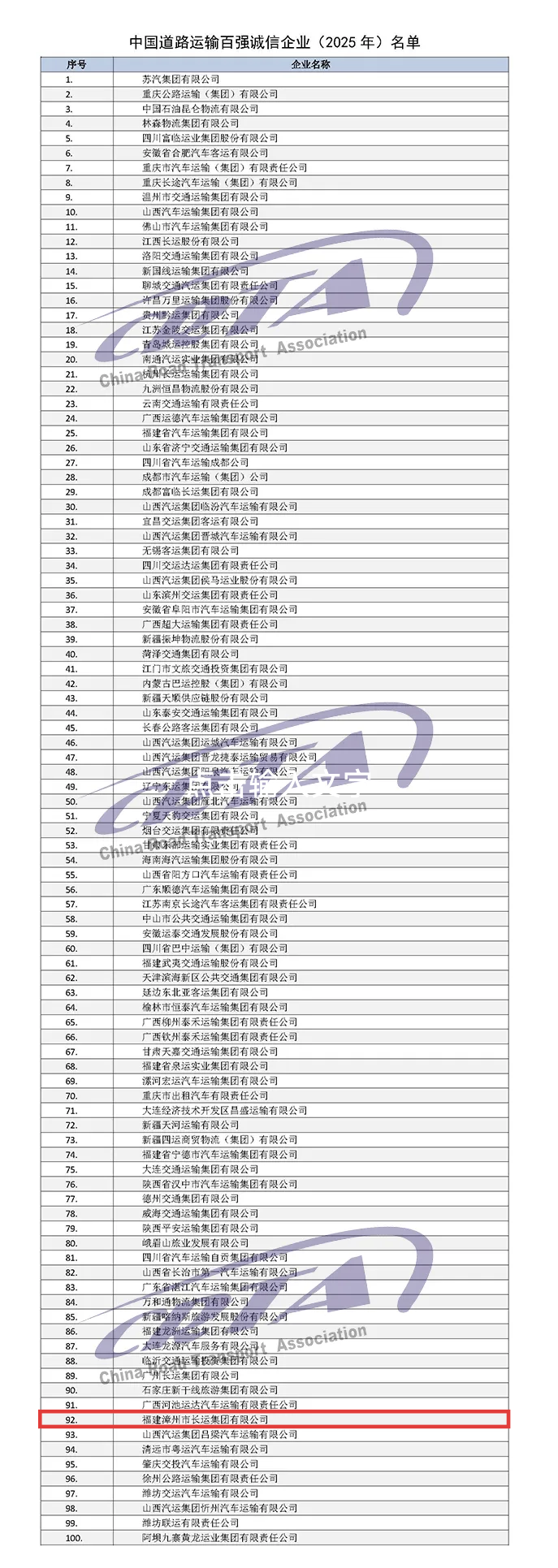 “中国道路运输百强诚信企业”评价体系涵盖企业规模实力、创新能力、社会公信及诚信经营等维度,由中国道路运输协会主办,是行业贯彻中央关于建设交通强国、推动现代流通体系发展决策部署的重要实践,是国内道路运输行业最具权威性和公信力的品牌活动之一。